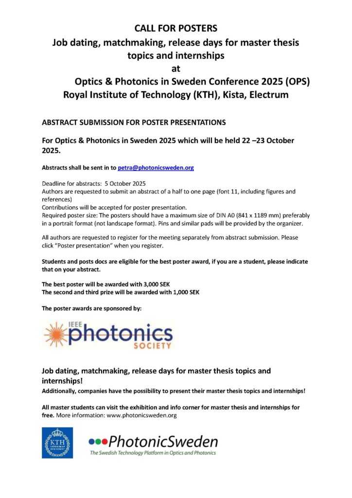 Submit abstracts for poster presentation to: petra@photonicsweden.org. Deadline for poster abstract submission is 5 October 2025. More info about the conference: https://photonicsweden.org/event/optics-and-photonics-in-sweden-conference-2025/ Best Poster Awards:… >>